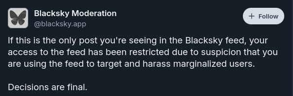 If this is the only post you're seeing in the Blacksky feed, then your access to the feed has been restricted due to suspicion that you are using the feed to target and harass marginalized users.